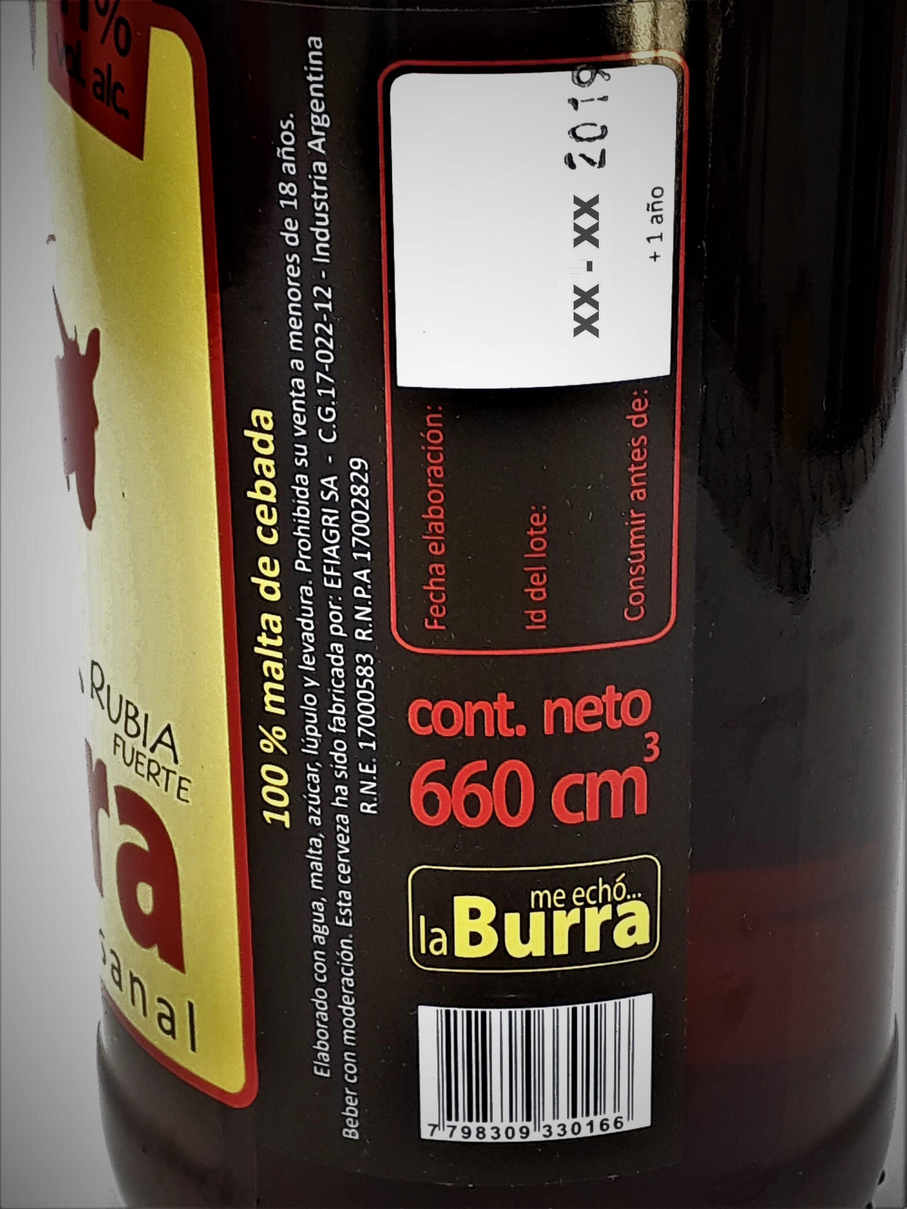 Cerveza Artesanal Me Pateo La Burra Rubia Fuerte 660cc x Caja 12 Bot